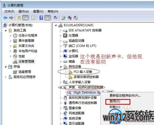 3.在打开里面的“设备管理器”,点击里面的“声音、视频和游戏控制器”。图中的禁成声卡为“Realtek High Definition Audio” (注意:每台电脑可能有所不懂,禁用的时候都可能都不一样。)点击右键停用声卡,然后重新启动下电脑