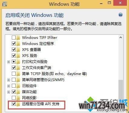 4、在windows功能窗口,在下方的列表中找到“远程差分压缩API支持”,并取消勾选,打开确定;