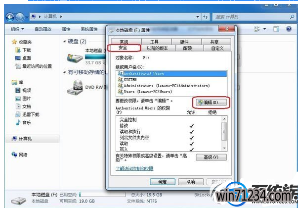 1.对需要设置权限的分区或者文件夹上单击鼠标右键,选择“属性”--“安全”--“编辑”;