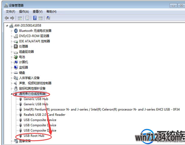 3.点击“通用串行总线控制”,在下方出现“USB Root Hub”设备列表中,右键点击“USB Root Hub”将其“禁用”菜单后再“启用”。