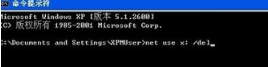 2、要断开某个网络驱动器的映射功能,请输入“net use x: /del”命令后回车(X:驱动器盘符),请断开所有网络驱动器的映射功能,请输入“net use * /del”命令后回车。