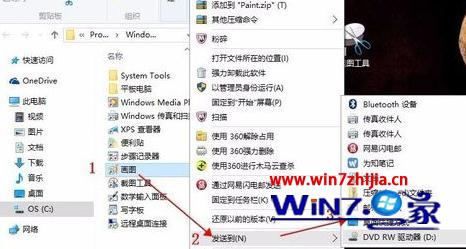 5、鼠标移到“画图”工具上,点击右键,在跳出的菜单中,把鼠标移到“发送到”选项,在右侧子菜单中选中“桌面快捷方式”;